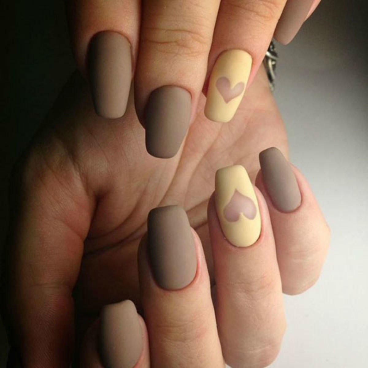 - Матовый коричневый глиттер прекрасно сочетается в маникюре с бархатистым финишем лака.